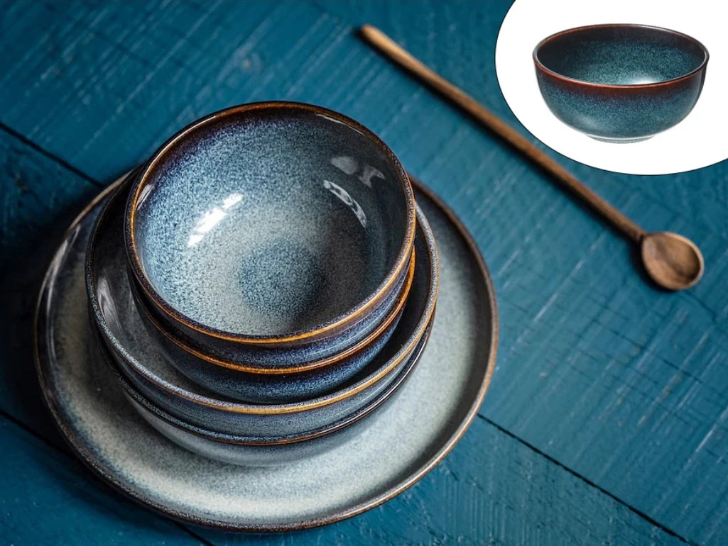 This ocean-blue, glazed plate, with golden-brown details, turns every meal into pure joy.