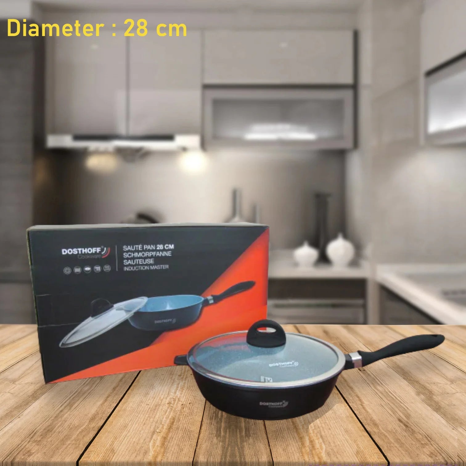 Dosthoff Induction Master Saute Pan Black with Cover: Diameter: 28 cm - Capacity 4.5 L German Greblon CK2 Marble Ceramic Coating Thick induction base to ensure even heat distribution Tempered glass cover with SS 18/10 Rim - does not rust ستوز مع مسكة طويلة قياس 28 سم سعة 4.5 ليتر مواد غير لاصقة ألمانية ماركة Greblon كعب سميك ويعمل على جميع الاسطح الحرارية غطاء من الزجاج المقوى مع بريم استنلس مضاد للصدأ