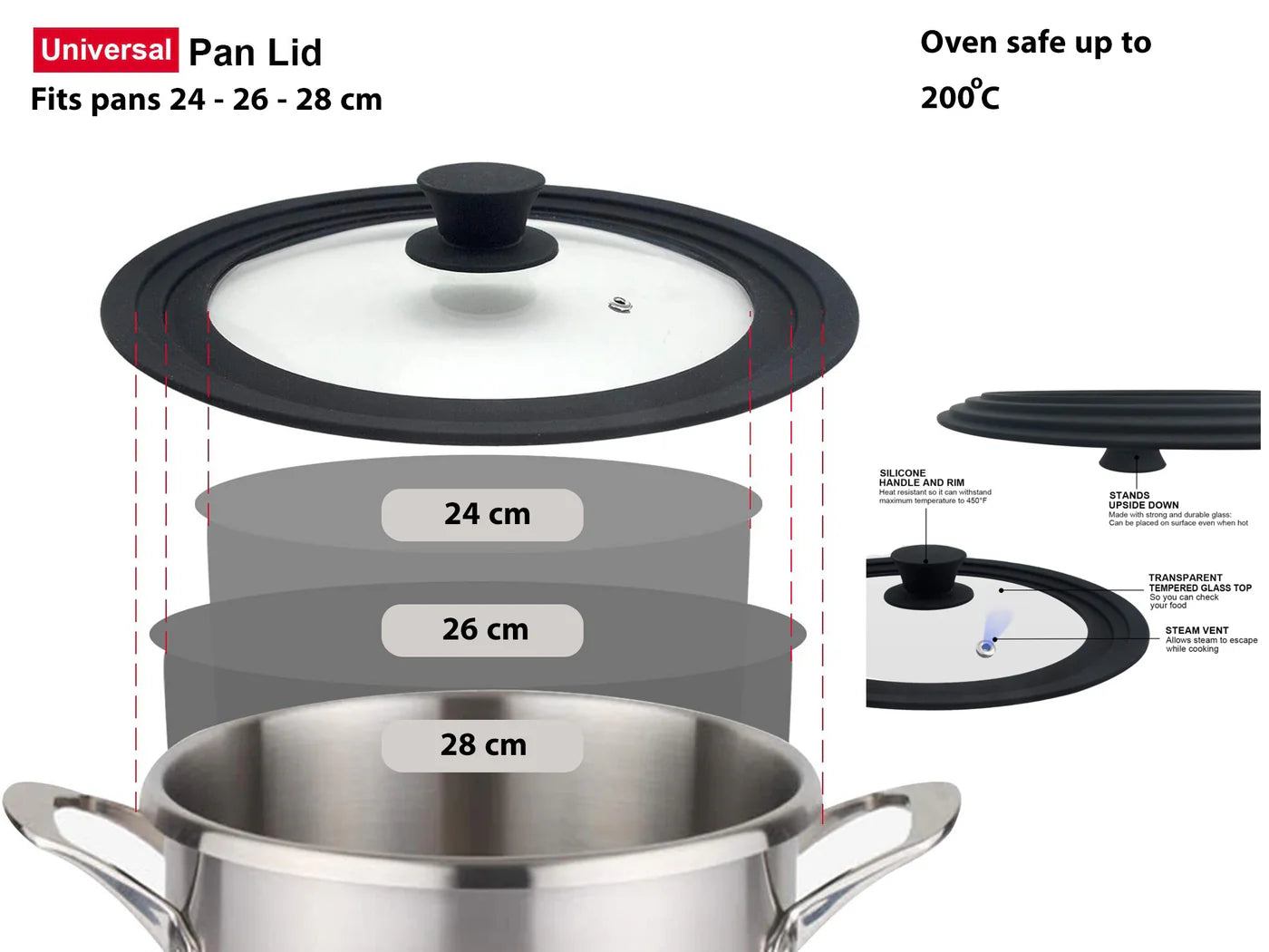 Glass Cover with Silicon Rim and Knob for 24 26 28 cm